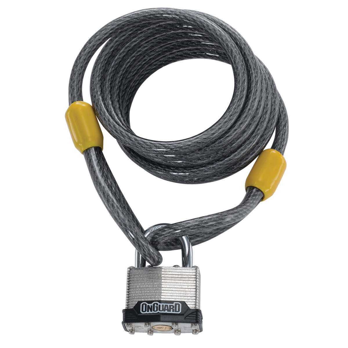 Laminated steel padlock with smooth brass lock mechanism and 8mm (0.32”) hardened steel shackle paired with a light duty 185cm x 8mm (6’ x 0.32”) vinyl coated twisted steel cable. Doberman series coil cable locks are lightweight, easy to carry, available with either keyed or combination lock mechanisms, and offer fast, convenient security for medium to low risk situations.