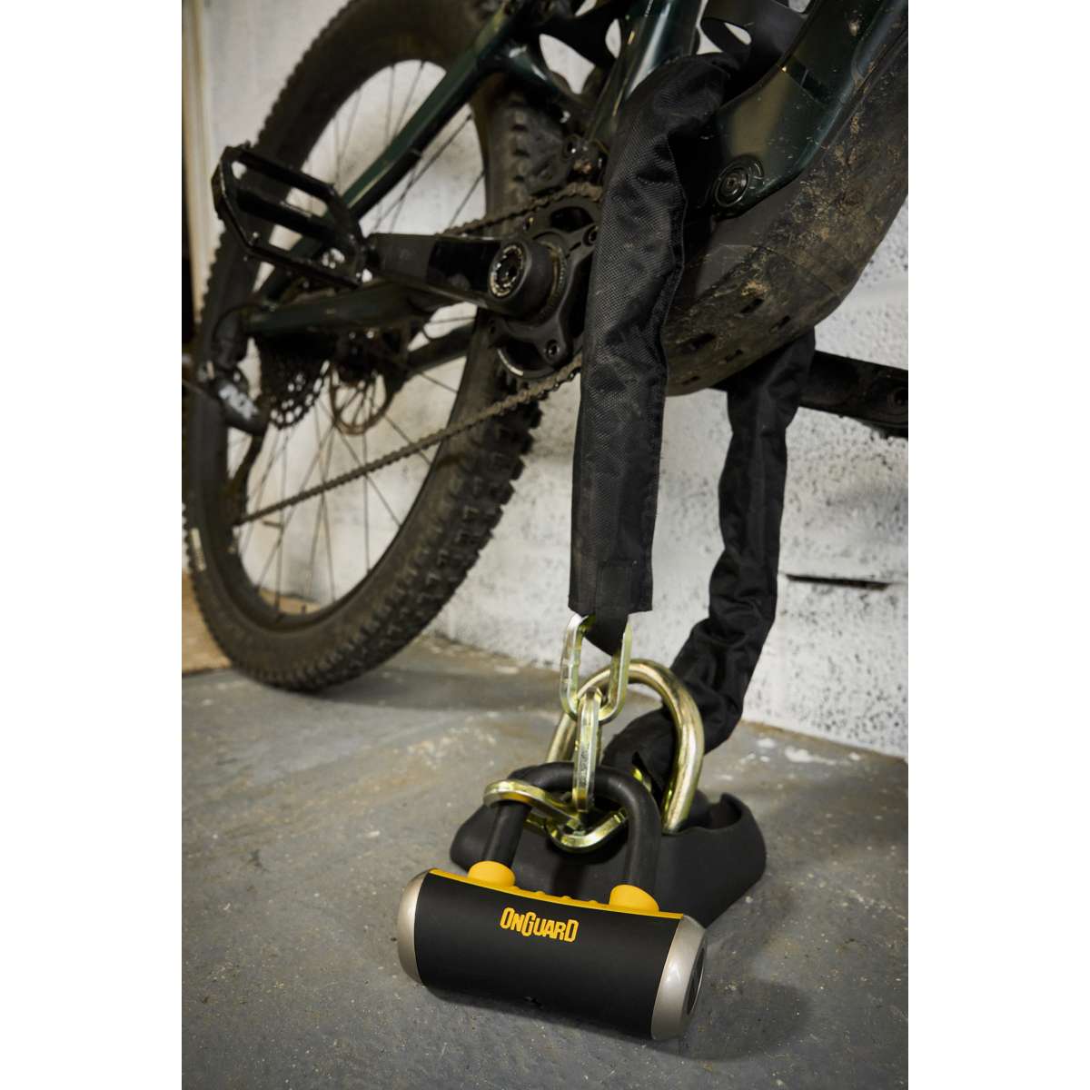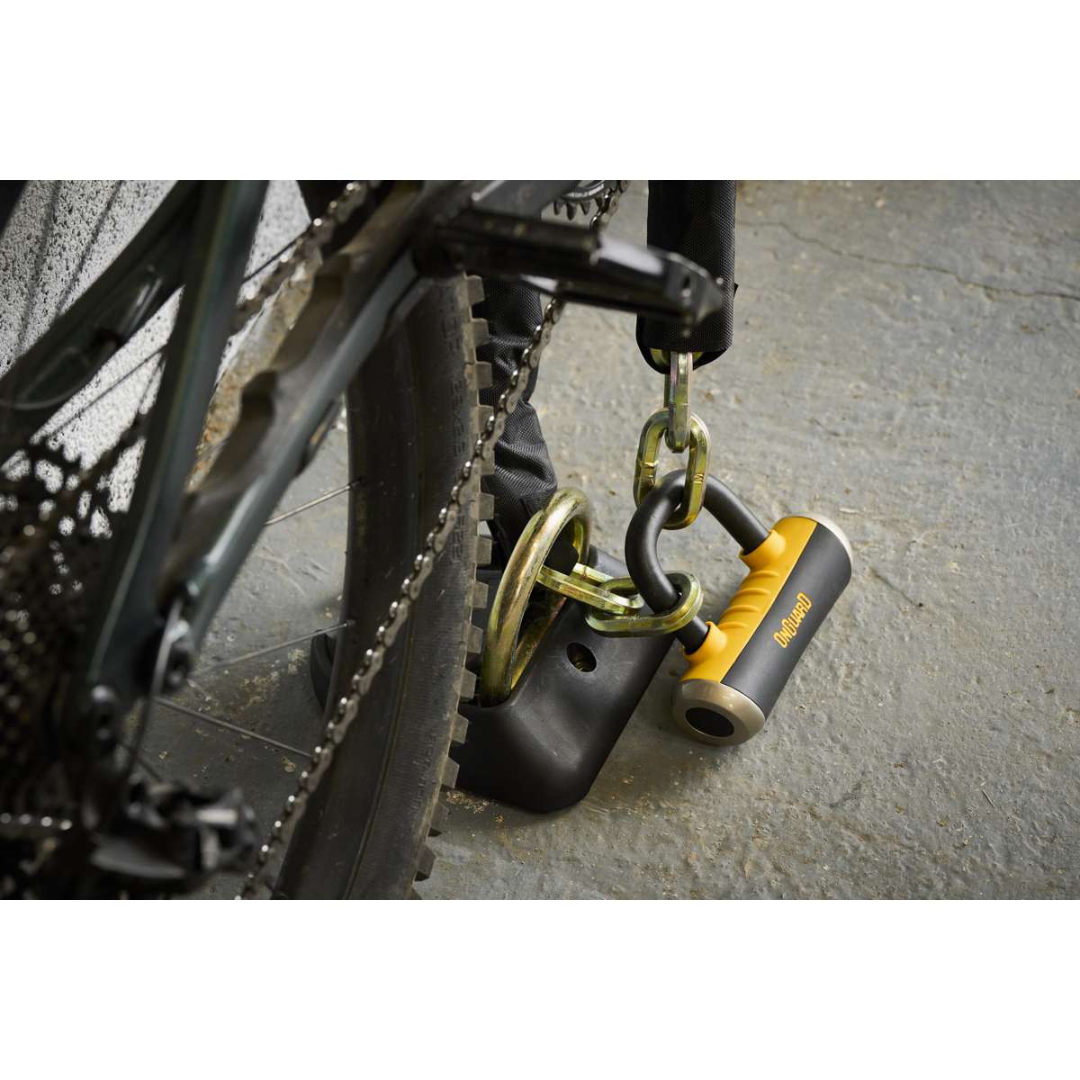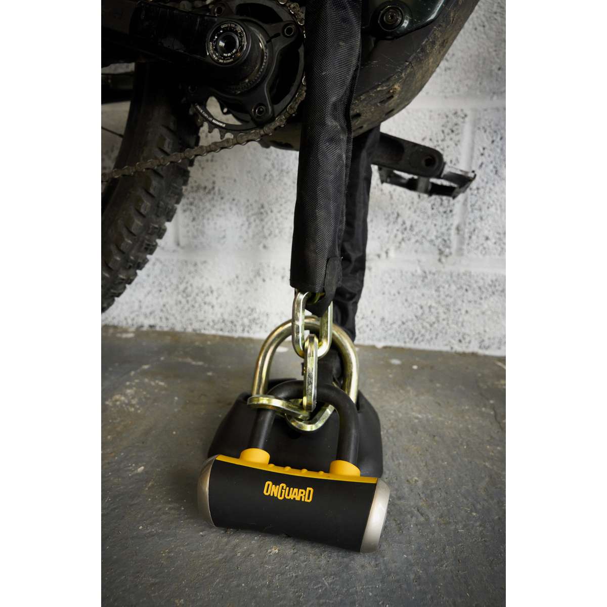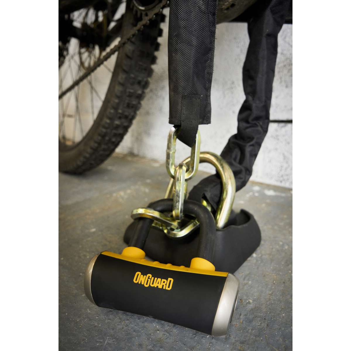 The OnGuard Mastiff 3.5’ Chain with X4 Padlock provides dual protection with a 1040 mm (40.9 in) titanium-reinforced hardened-steel hex link chain and a short-shackle Boxer U-lock featuring the X4P Quad Lock. The lock secures the shackle on four sides to resist twisting and prying, while the 45 mm (1.8 in) chain sleeve prevents scratches. The Z-Cylinder core blocks bumping, drilling, and picking for lasting reliability. The Boxer U-lock can also be used separately as a disc lock. **Includes five laser-cut keys (one with LED).**