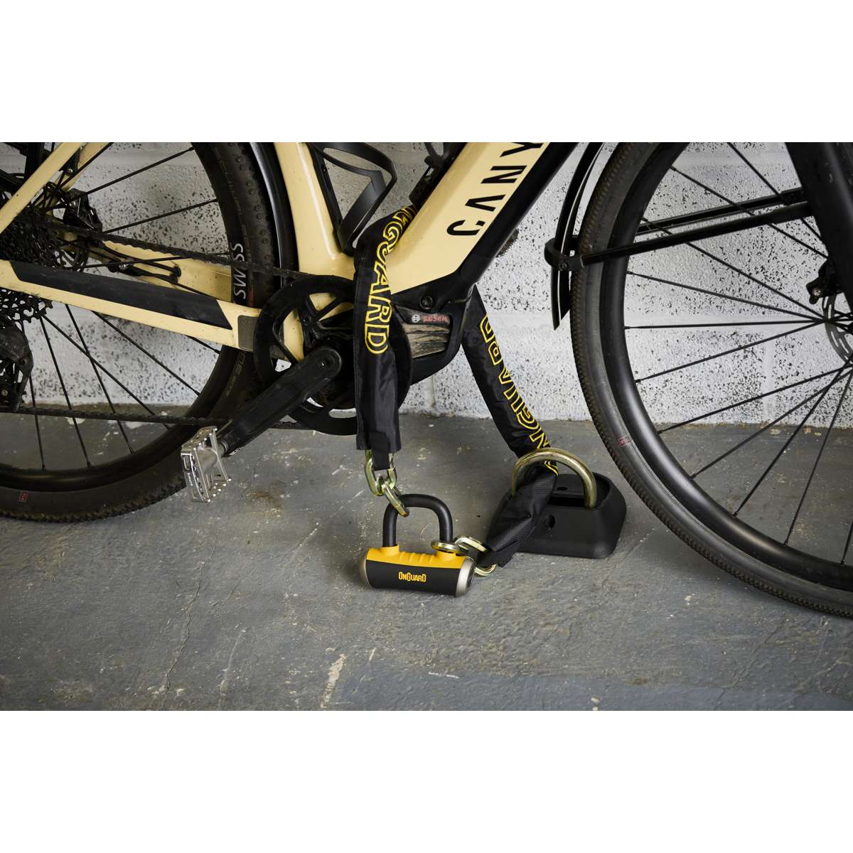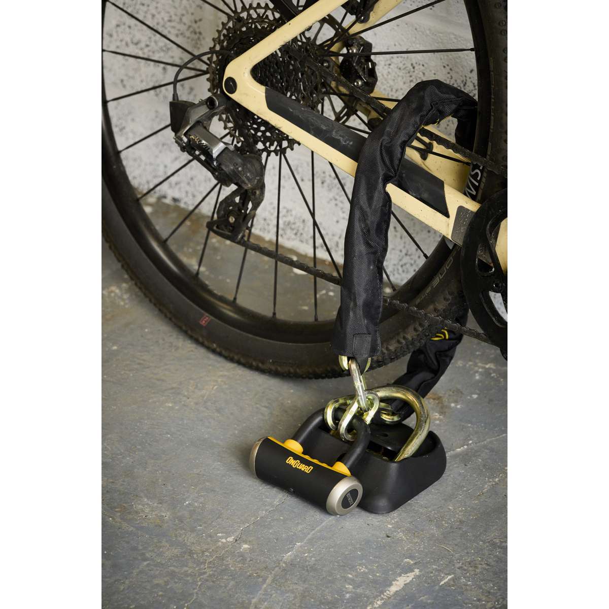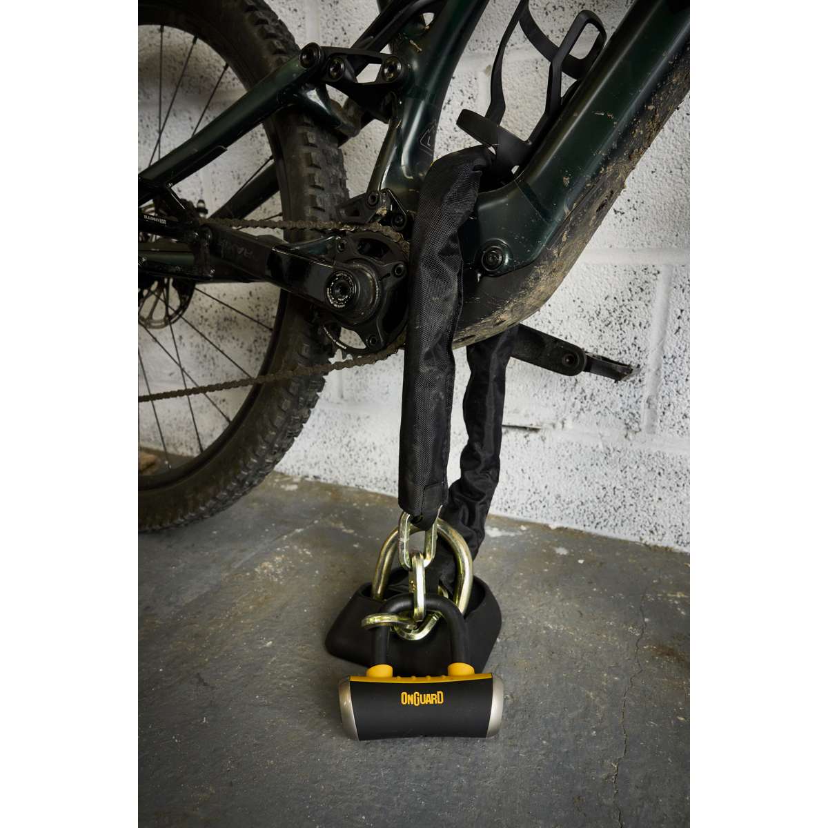 The OnGuard Mastiff 3.5’ Chain with X4 Padlock provides dual protection with a 1040 mm (40.9 in) titanium-reinforced hardened-steel hex link chain and a short-shackle Boxer U-lock featuring the X4P Quad Lock. The lock secures the shackle on four sides to resist twisting and prying, while the 45 mm (1.8 in) chain sleeve prevents scratches. The Z-Cylinder core blocks bumping, drilling, and picking for lasting reliability. The Boxer U-lock can also be used separately as a disc lock. **Includes five laser-cut keys (one with LED).**