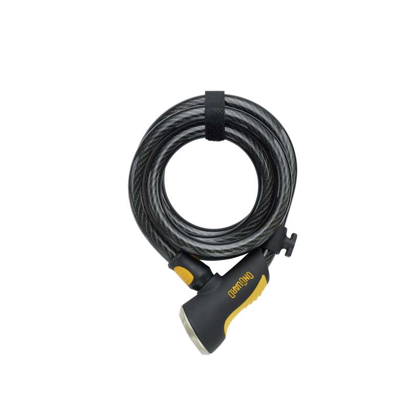 The OnGuard Doberman Coiled Key Cable delivers heavy-duty security and everyday convenience in a compact, self-coiling design. Its 185 cm × 15 mm braided-steel construction resists cutting, pulling, and twisting, while the X2P Power Double Bolt lock mechanism secures both sides of the cable for maximum strength. A thick vinyl coating protects paint and finishes, and the included All-Tube Twist Lock mount provides easy transport on any bike. With five laser-cut keys (one with LED light), plus a hook-and-loop strap for tidy storage, the Doberman Coiled Key Cable is an ideal balance of power, flexibility, and everyday practicality.
