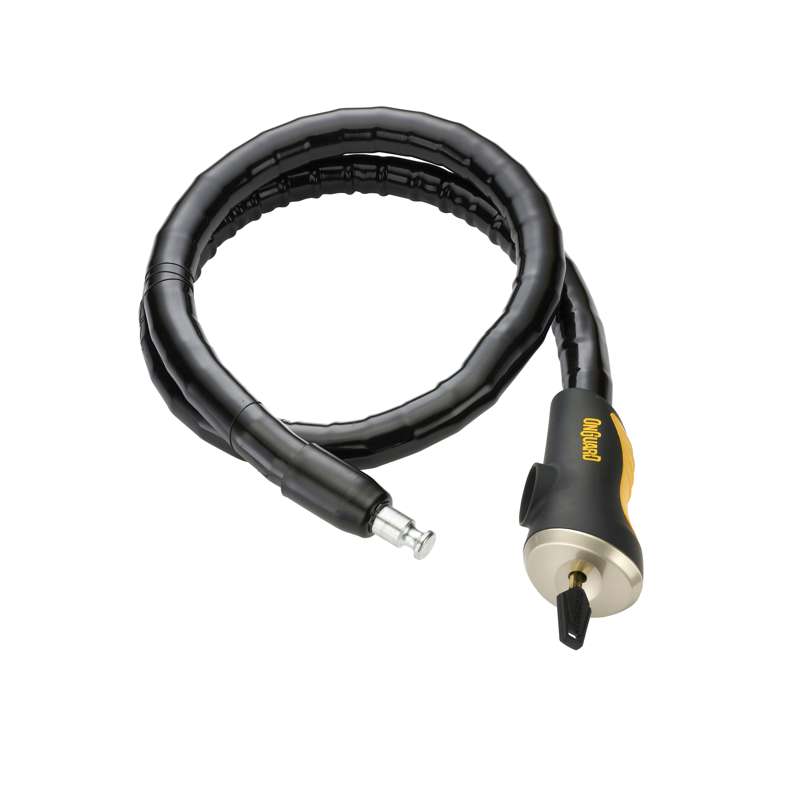 The OnGuard Rottweiler 4' Armored Key Cable delivers serious security in a compact, portable package. Its 4-foot flexible twisted-steel core is wrapped in hardened steel armor to resist bolt cutters and prying attacks. The X2P Double Bolt Lock secures both sides of the shackle for maximum holding power, while the Z-Cylinder core provides advanced protection against picking and drilling. A durable vinyl coating prevents scratches and finish damage. Includes five precision laser-cut keys, one with a built-in LED for night use, ideal for bikes, gates, scooters, and gear.