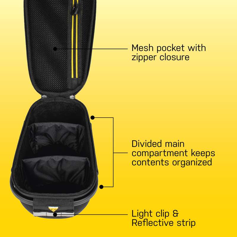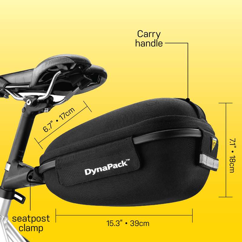 The Topeak DynaPack Aerodynamic Saddle Bag is a lightweight, water-repellent storage solution designed for cyclists who value speed and utility. With its sleek profile, this bag reduces air resistance while fitting neatly beneath the saddle using secure hook-and-loop straps and a stabilizing rubber seatpost strap. The unique center-opening design offers quick, easy access to your tools, tubes, snacks, or personal essentials during rides. Constructed from elastic polyurethane fiber and EVA foam, it provides long-lasting protection against rain, dust, and impact. Available in Micro (0.35 L) and Small (0.8 L) sizes, it’s perfect for performance-focused riders who want style and function in one aerodynamic package.