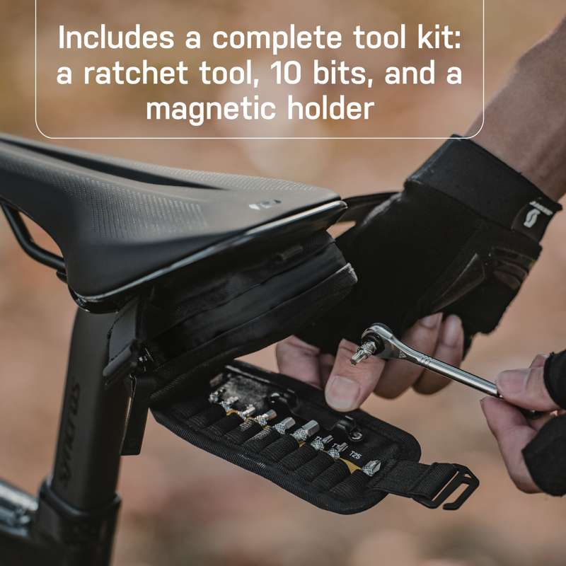 The Topeak Elementa GearBag EX is a compact under-seat storage system designed for cyclists who demand functionality and speed. Its smart Rail Wing System allows quick access to tools and essentials without removing the entire bag, while the fold-out compartment neatly organizes a complete ratchet toolkit with 10 precision bits. Built from rugged, water-repellent 1000D polyester with aluminum hardware, it provides reliable protection against rain, dust, and debris. Perfect for commuters and long-distance riders seeking a discreet, all-in-one repair solution.