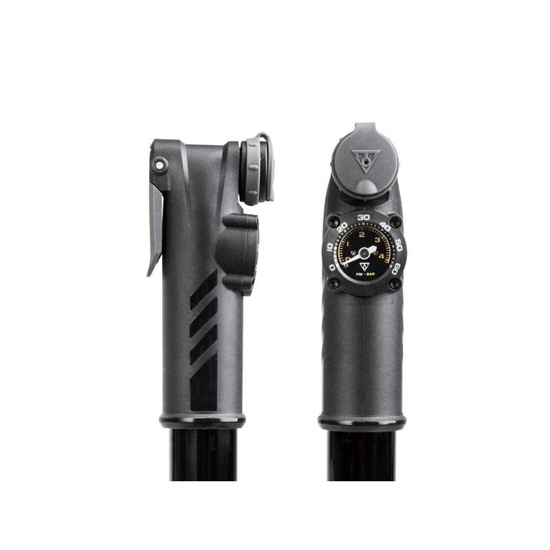 The Topeak Mountain DA G is a premium high-volume mini pump built for mountain bikers who need rapid tire inflation and accuracy on the trail. Featuring Dual-Action (DA) technology, it pumps air on both strokes—delivering double the volume of standard pumps for faster results. Its large, integrated 1-1/8” analog gauge offers precise readings up to 60 psi / 4 bar, ensuring optimal pressure every time. Crafted from durable aluminum with a polymer handle and thumb lock, this compact pump withstands rugged riding conditions. Includes a side-mount bracket for easy storage, combining portability and performance in one essential MTB tool.
