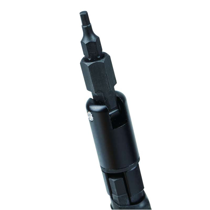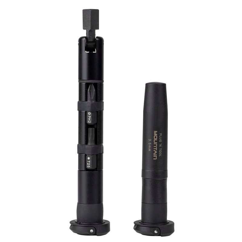 The Topeak Plug’n Tool Mountain is a dual concealed tool system that fits neatly inside mountain bike handlebars, giving riders immediate access to two compact kits for quick on-trail repairs. One side features a 3.5mm plug insertion tool with three 3.5mm x 50mm tire plugs for tubeless puncture fixes, while the other side houses a 7-bit multitool with 3 / 4 / 5 / 6 / 10mm Allen keys, a T25 Torx bit, and a #2 Phillips bit. Crafted from hardened steel and engineering-grade polymer, both modules install securely into bar ends, keeping tools discreet, balanced, and rattle-free.
