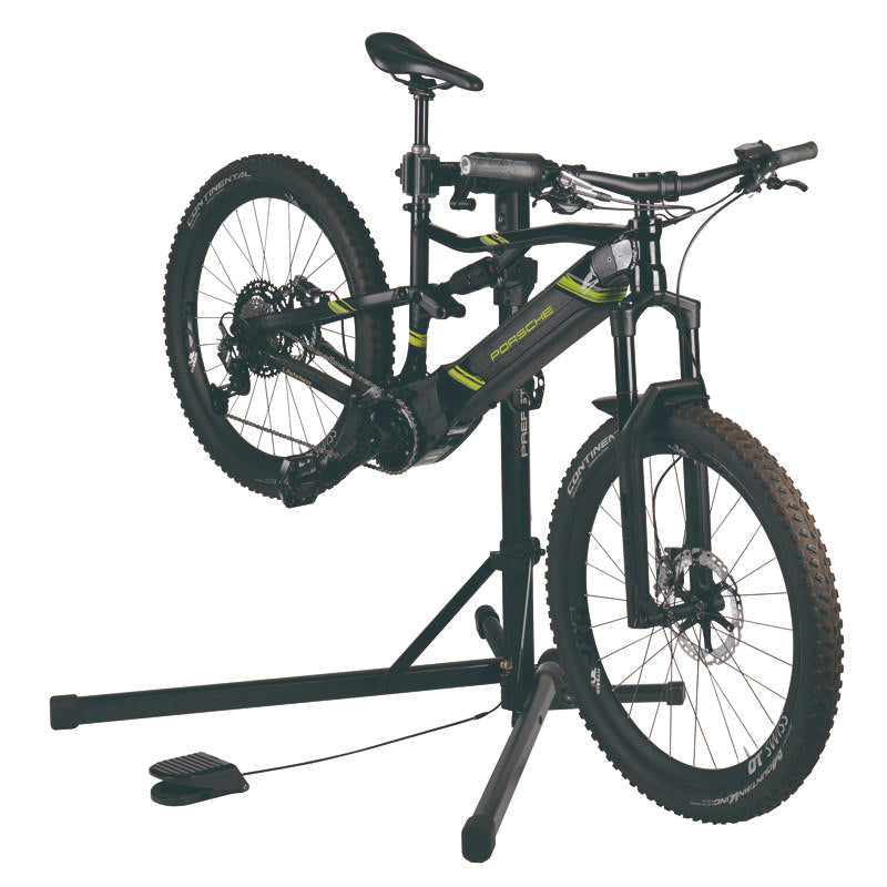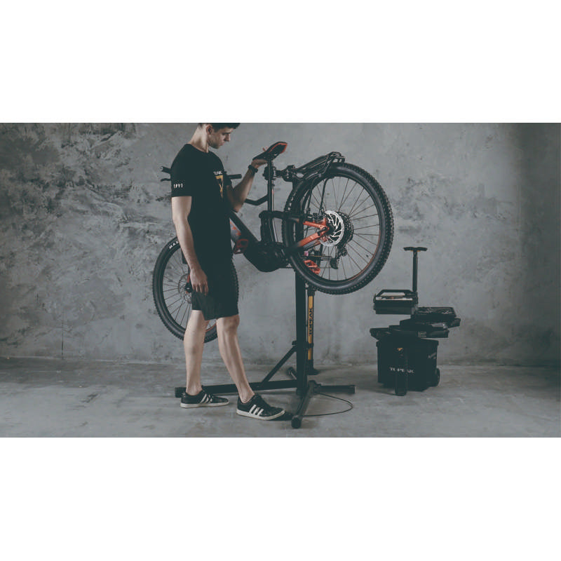The Topeak PrepStand eUP Pro is the world’s first lift-assisted foldable workstand engineered for eBikes and heavy-duty bicycles. Designed to handle bikes weighing up to 35kg (77lb), it features a built-in pressurized cartridge that delivers 17kg (37lb) of lifting assistance via a convenient foot pedal. The reinforced support unit ensures superior stability when working on larger frames, while the 360° rotatable clamp head with non-marring rubber jaws secures tubes from 22.2mm to 76.2mm. Perfect for maintenance, cleaning, or repairs, the stand folds down quickly for transport or compact storage—making it an essential tool for professional workshops or home mechanics.