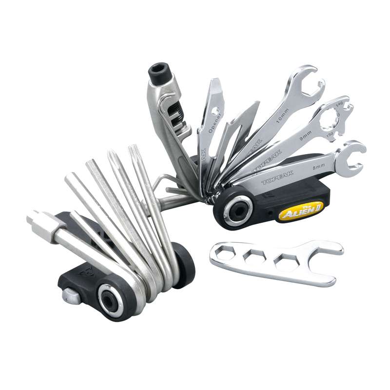 The Topeak ALiEN II is an award-winning 31-function multi-tool designed for cyclists who demand reliability, versatility, and compactness. Featuring a two-piece body for easy access and improved leverage, it includes tools for nearly every on-road or trail repair—from Allen and Torx wrenches to tire levers, a chain breaker, and even a bottle opener. Built from durable chrome vanadium steel and housed in an engineering-grade polymer frame, the ALiEN II balances strength with portability. At just 290 g (10.2 oz), it fits easily in any saddlebag or jersey pocket and comes with a heavy-duty nylon carrying case for secure transport.