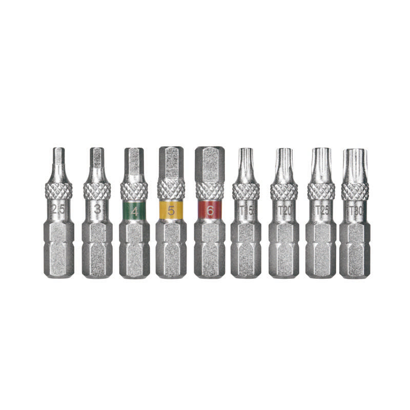 Torque wrench with adjustable preset range of 2-10Nm features a standard hex drive reversible ratcheting head. Includes magnetic bit holder for adding leverage, fingertip bit holder for narrow space, and 9 tool bits with a generous 30mm length for reaching tough bolt locations. Knurling on the individual tool bits provides additional grip when changing or removing from the organizer and ratchet tool head. Fits neatly into a storage box.