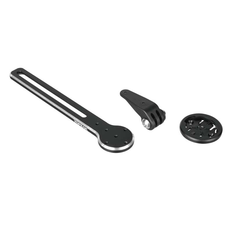 The Topeak UTF Multi-Mount (150mm) is an innovative mounting solution designed specifically for integrated stem and handlebar systems. Crafted from forged aluminum and engineering-grade polymer, this mount offers a sturdy and lightweight platform for attaching various devices. It comes equipped with G-Ear and SC adapters, allowing for the secure attachment of cycle computers (Garmin Edge, Wahoo, Sigma), Topeak front lights (CubiCubi 500, HeadLux 450 USB, HeadLux 100 USB), and sport cameras. The adjustable length mounting positions ensure a proper fit for different devices, enhancing viewing convenience and ride experience. With a maximum load capacity of 220g and weighing just 45g, the UTF Multi-Mount combines durability with minimal weight addition.
